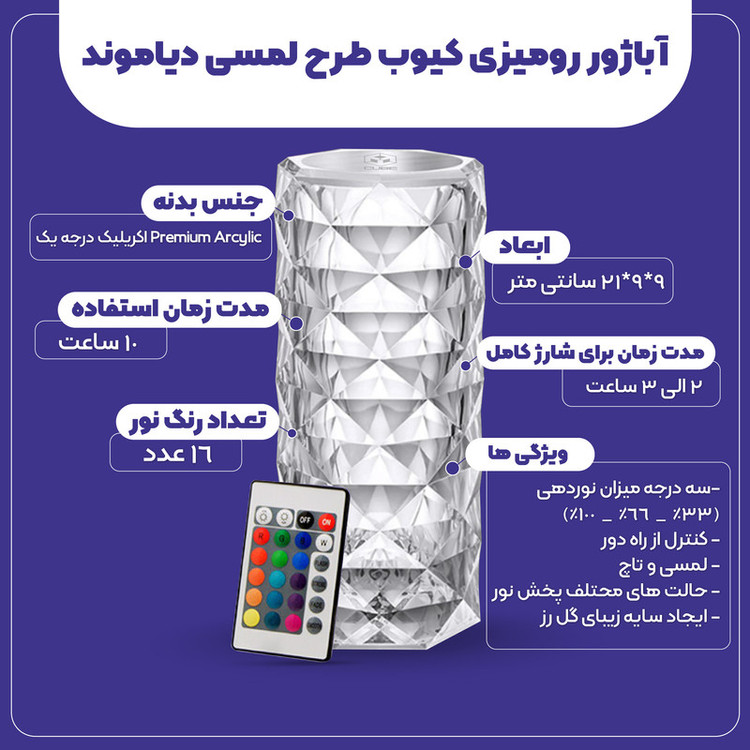آباژور رومیزی کیوب طرح لمسی Diamond، یک تجربه بینظیر از تلفیق نور و اکرلیک (طرح شیشه) میباشد. این محصول با استفاده از فناوری سه بعدی، کاری میکند تا نور و سایه درهم تنیده شوند تا لایه های گل رز روی میز شکوفه دهند. این آباژور رومیزی با روشنایی و زیباییای که دارد میتواند فضایی کاملا شیک و مدرن را برای شما به ارمغان بیاورد و در تمامی مجالس و مکان ها جلوه ای ویژه از زیبایی را بوجود آورد. برای تنظیم روشنایی؛دیگر نیازی نیست در تاریکی شب دنبال کلید آباژور بگردید و کافی است فقط بالای آباژور را لمس کنید. 6 سطح تنظیم از تیره تا روشن وجود دارد. شما می توانید آزادانه روشنایی نور مناسب را انتخاب کنید. رنگ روشن، زرد گرم، کهربایی، بنفش-قرمز، فیروزه ای، آبی، یاسی و ...(16 رنگ). طراحی سوئیچ لمسی که در بالای آباژور وجود دارد میتواند به شما کمک کند تا براحتی رنگ های آباژور را تنها با لمس کردن تغییر داده و یا با چند ثانیه لمس ممتد حتی آباژور را خاموش کنید. آباژور رومیزی کیوب طرح Diamond دارای باطری با طول عمر بالا و به راحتی با کابل USB شارژ میشود. مدت زمان شارژ کامل دستگاه از 1-3 ساعت، و مدت زمان روشن ماندن آن برای 10-12 ساعت به صورت مستمر میباشد، شارژ آباژور رومیزی از طریق پورت USB بسیار راحت است و علاوه بر این محصول دارای ریموت کنترل جدا میباشد تا از فاصله ی دور تا برد 5متر نیز بتوان به صورت کامل میزان نور، رنگ و خاموش یا روشن شدن آباژور را کنترل کرد. آباژور رومیزی طرح لمسی Diamond را میتوان برای کمپینگ، مسافرت، موقعیتهای اضطراری و سایر نیازهای روشنایی نیز استفاده کرد.این آباژور برای تمامی فضاها اعم از میز کنار تخت و اتاق خواب، اتاق نشیمن، اتاق غذاخوری، اتاق مطالعه، دیزاین دکوراسیون ، اتاق های صنایع دستی، راهرو، کمد، رستوران، هتل، ادارات و غیره مناسب است. نکته مهم: “حتما بعد از خرید آباژور را چند ساعت داخل شارژ قرار دهید تا کامل شارژ شود و بعد آن را روشن کنید”