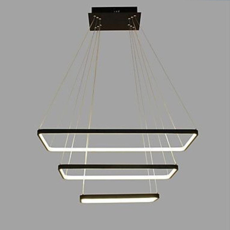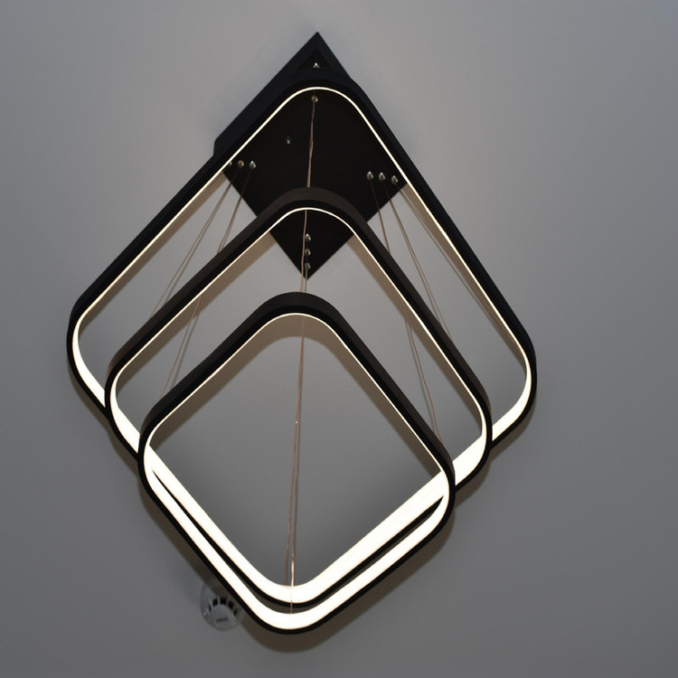 لوستر سه حلقه مربع به ابعاد -40-50-60 سانتیمتر ،رنگ بدنه مشکی مات،در سه نوع (آفتابی ،مهتابی و چند رنگ) ارائه میشود ، دارای ریموت کنترل است و از امکانات ریموت میتوان به کم و زیاد کردن نور ،حالت شب و خاموش روشن کردن نور واپلیکیشن موبایل اشاره کرد