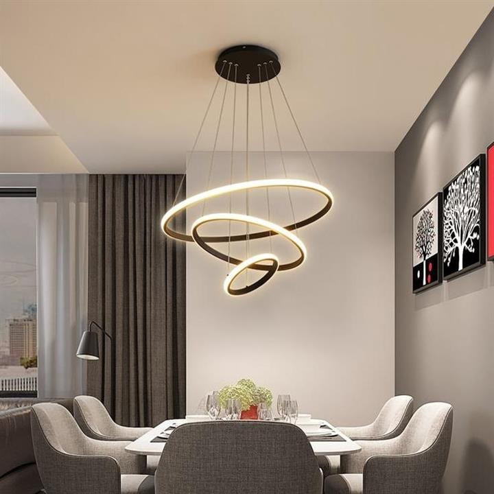 این مدل لوستر ام کی لایتینگ مدل نور به بیرون سه حلقه ،با قطرهای 70-50-35 می باشد ،که با بدنه مشکی ارائه شده ، و در سه رنگ نور ،آفتابی و مهتابی و همزمان هردو (چند رنگ ) قابل انتخاب می باشد. ارتفاع لوستر از 20 سانت تا 80 سانت قابل تغییر است ،همچنین می توانید چیدمان لوستر را ، به طبقاتی یا کهکشانی تغییر دهید. با ریموت و اپلیکیشن موبایل میتوان نور لوستر را کم و زیاد کرد ،طبقات را خاموش و روشن کرد ،و همچنین دکمه حالت شب از امکانات ریموت می باشد.